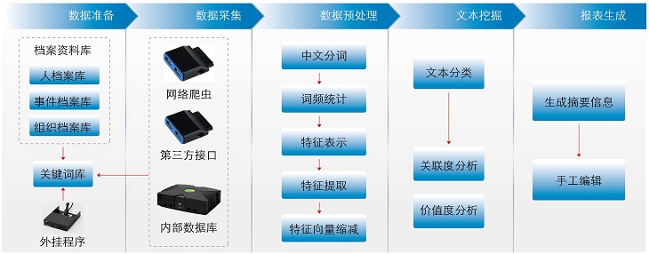 形成一套適合用于公安隊(duì)伍的可行的情報(bào)挖掘甄別輔助系統(tǒng),可高效地管理來(lái)自網(wǎng)絡(luò)及內(nèi)部數(shù)據(jù)庫(kù)的輿情信息,監(jiān)控重大事件輿情,發(fā)現(xiàn)危害輿情信息,并自動(dòng)對(duì)輿情信息進(jìn)行分類,有效提高信息化工作水平??傮w流程如下圖: